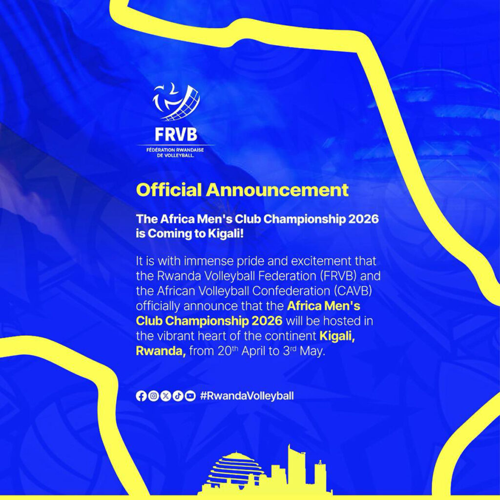 Kigali yongeye kwerekana ko ari umujyi wiyubatse kandi ushobora kwakira amarushanwa akomeye ku mugabane, nyuma y’uko Ishyirahamwe rya Volleyball mu Rwanda (FRVB) ku bufatanye n’Ishyirahamwe rya Volleyball rya Afurika (CAVB) ritangaje ko Africa Men’s Club Championship 2026 izabera mu Rwanda kuva tariki ya 20 Mata kugeza ku ya 3 Gicurasi 2026.