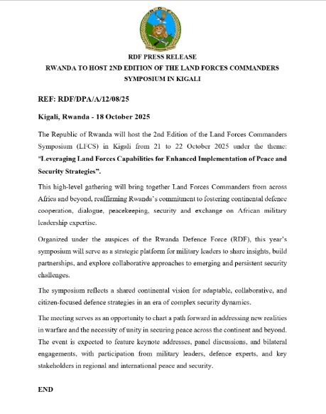 Kigali – uyu munsi Tariki ya 18 Ukwakira 2025 – U Rwanda rwatangaje ko rugiye kwakira ku nshuro ya kabiri inama y’abakomando b’ingabo za Afurika (Land Forces Commanders Symposium – LFCS), igamije kurebera hamwe uko ingabo zishobora kurushaho kugira uruhare mu kwimakaza amahoro n’umutekano ku mugabane. Iyo nama izabera i Kigali kuva ku itariki ya 21 kugeza ku ya 22 Ukwakira 2025, ikazaba ifite insanganyamatsiko igira iti: “Gukoresha ubushobozi bw’ingabo mu gushyira mu bikorwa neza ingamba z’amahoro n’umutekano.”